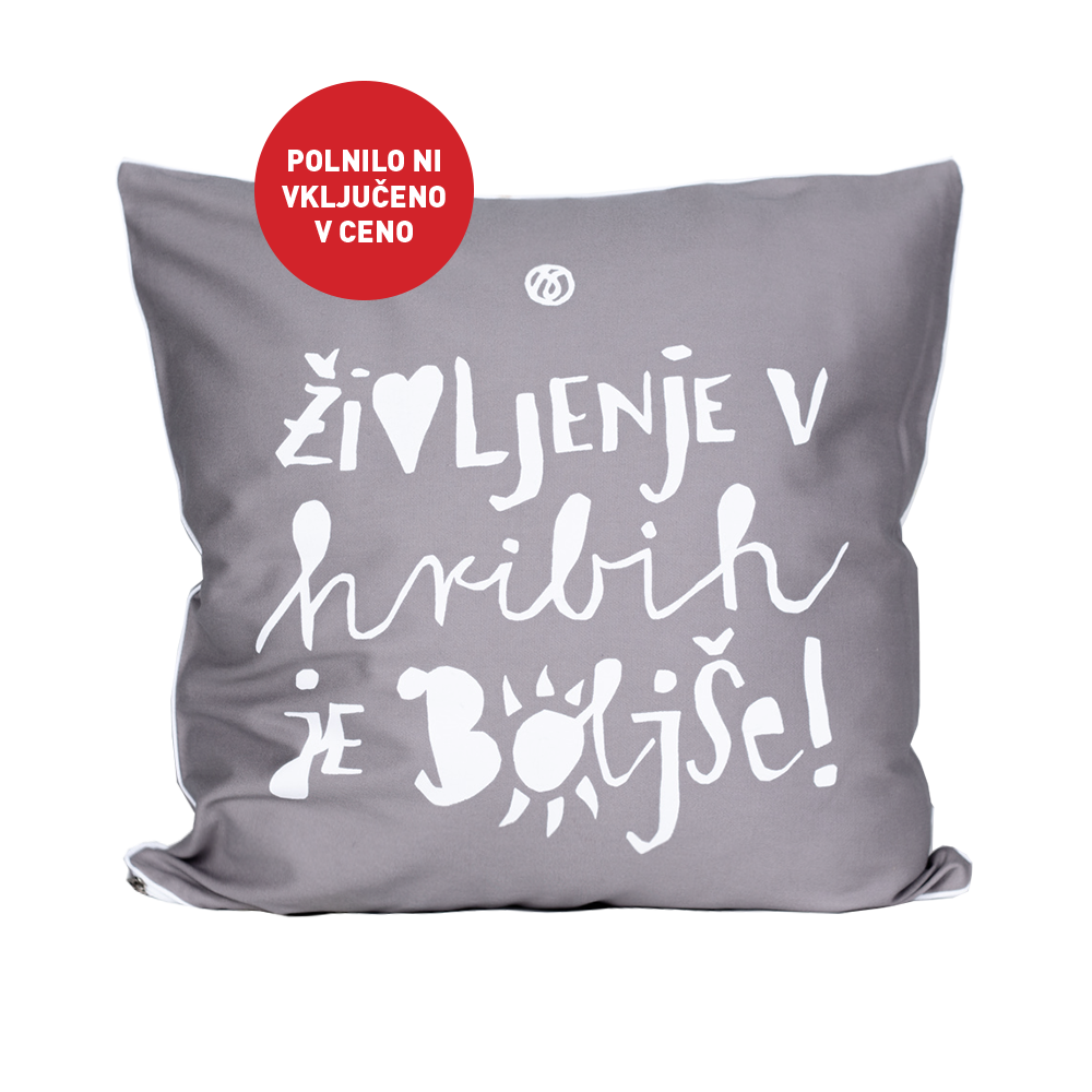 Okrasna blazina sive barve z belim napisom Življenje v hribih je boljše.